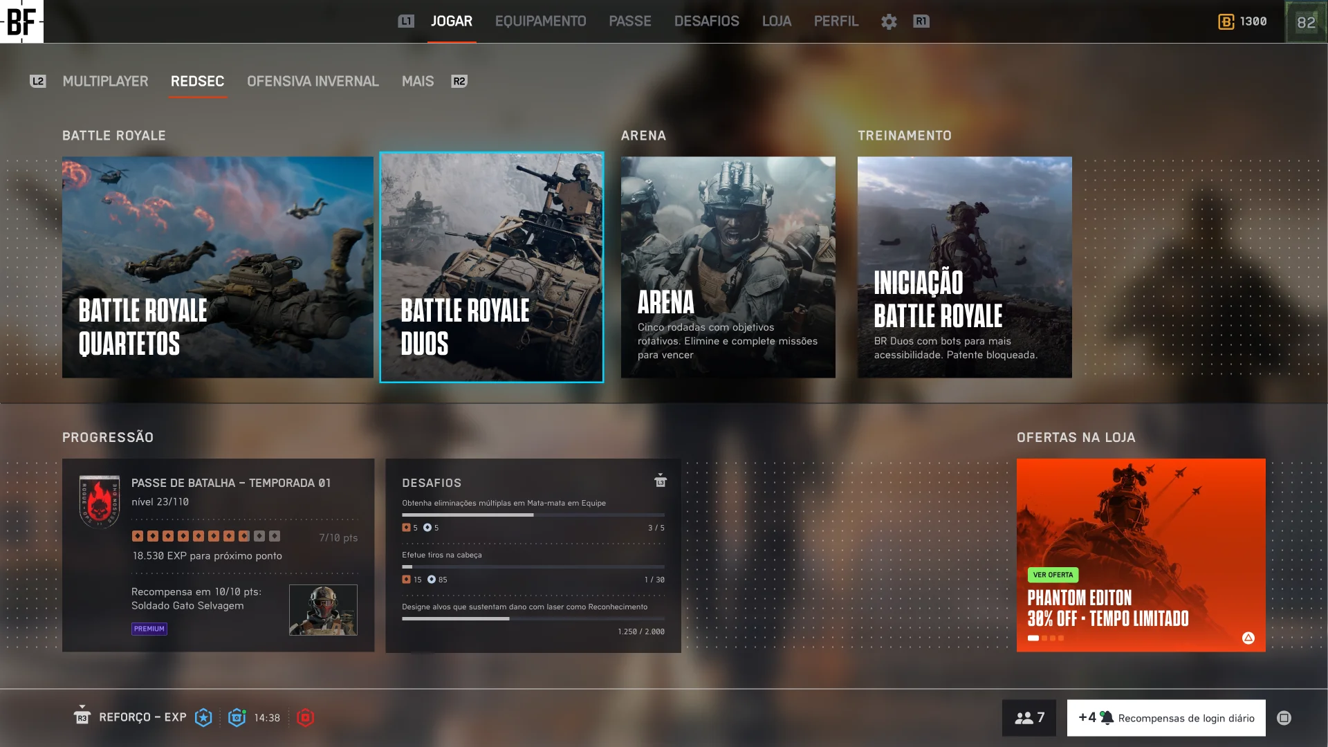 Protótipo navegável no Figma (Tela inicial com 4 abas: Multiplayer, RedSec, Evento, Mais)